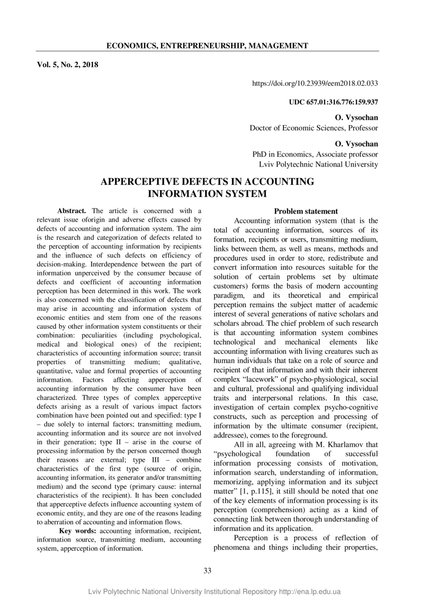 | dc.identifier.citationen | Vysochan O. Apperceptive defects in accounting information system / O. Vysochan, O. Vysochan // Economics, Entrepreneurship, Management. — Lviv : Lviv Politechnic Publishing House — Vol 5. — No 2. — P. 33–38. | |