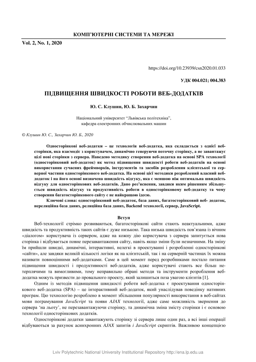 | dc.identifier.citationen | Klushyn Y. Increase the speed of web applications / Y. Klushyn, Y. Zakharchin // Kompiuterni systemy ta merezhi. — Lviv : Lviv Politechnic Publishing House, 2020. — Vol 2. — No 1. — P. 33–43. | |