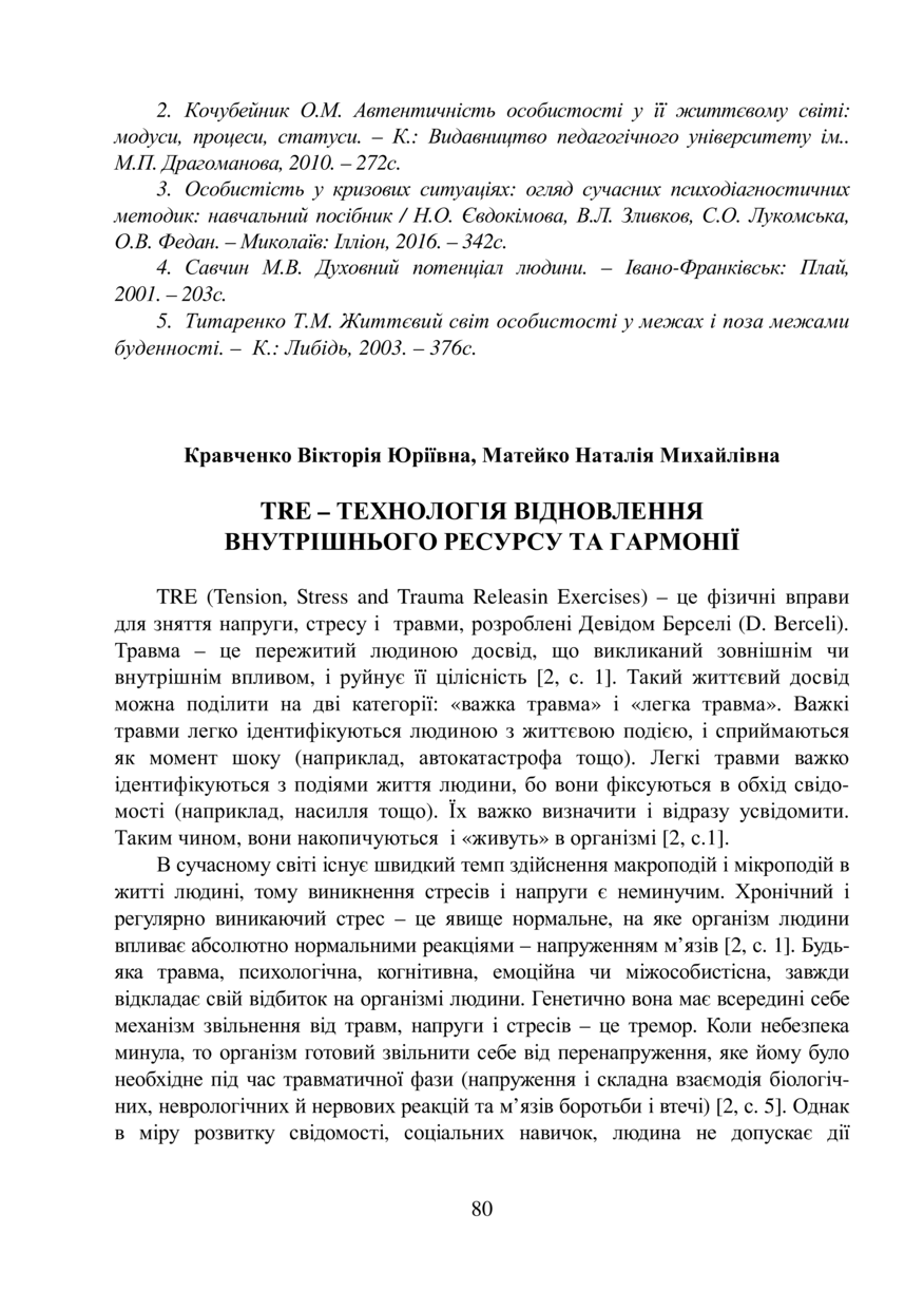 Кравченко В. Ю. TRE – технологія відновлення внутрішнього ресурсу та гармонії / Вікторія Юріївна Кравченко, Наталія Михайлівна Матейко // Психологія національної безпеки і благополуччя особистості : тези І Міжнародної науково-практичної конференції, 14–15 березня 2019 року, Львів. — Львів : Видавництво Львівської політехніки, 2019. — С. 80–82.