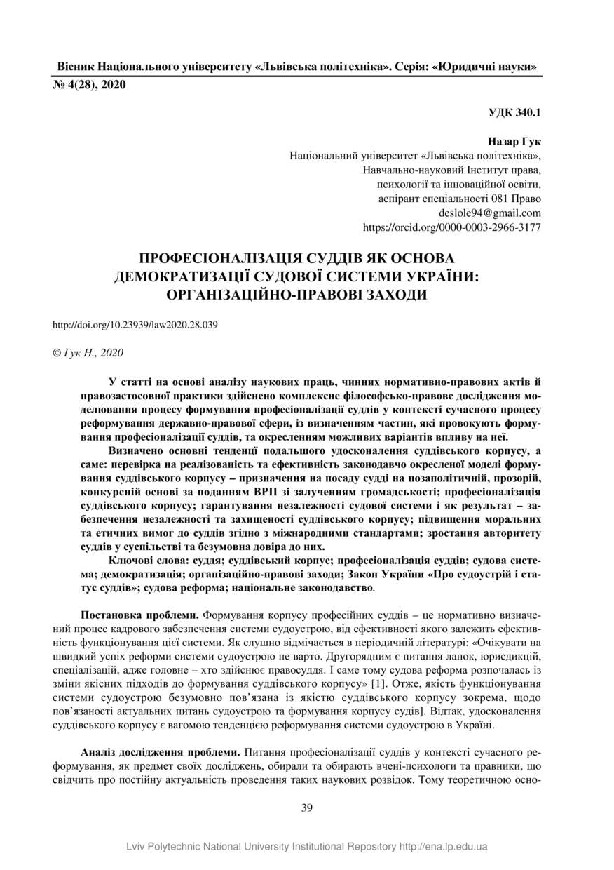 | dc.identifier.citationen | Huk N. Professionalization of judges as a basis for democratization of the judicial system of Ukraine: organizational and legal measures / Nazar Huk // Visnyk Natsionalnoho universytetu "Lvivska politekhnika". Serie: Yurydychni nauky. — Lviv : Lviv Politechnic Publishing House, 2020. — Vol 7. — No 4 (28). — P. 39–46. | |