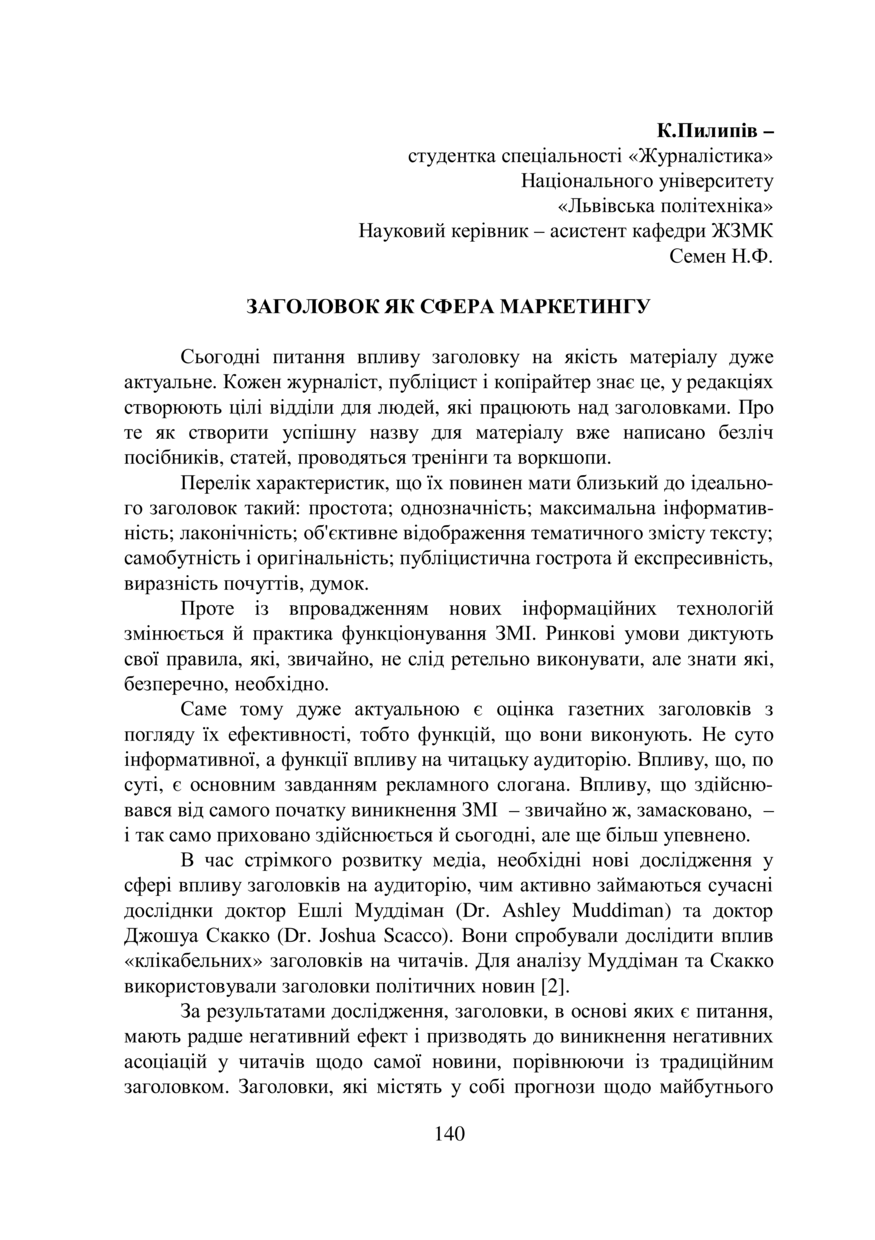 Пилипів К. Заголовок як сфера маркетингу / К. Пилипів, Н. Ф. Семен // ЗМІ та демократичний розвиток України : збірник матеріалів III Всеукраїнської конференції студентів та молодих дослідників, 20 березня 2018 року, Львів. — Львів : Видавництво Львівської політехніки, 2018. — С. 140–142.