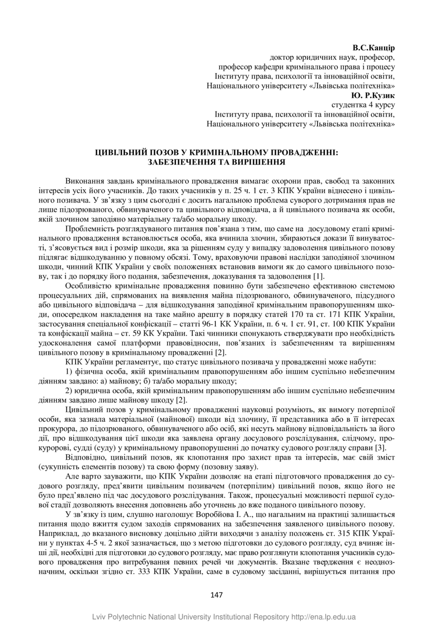 Канцір В. С. Цивільний позов у кримінальному провадженні: забезпечення та вирішення / В. С. Канцір, Ю. Р. Кузик // Захист прав і свобод людини та громадянина в умовах формування правової держави : збірник тез ІХ Всеукраїнської науково-практичної конференції, 30 травня 2020 року, Львів. — Львів : Видавництво Львівської політехніки, 2020. — С. 147–148. — (Кримінально-правові аспекти захисту прав і свобод людини та громадянина в умовах формування правової держави).