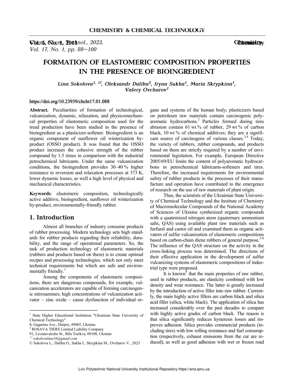 Formation of Elastomeric Composition Properties in the Presence of Bioingredient / Lina Sokolova, Oleksandr Daliba, Iryna Sukha, Maria Skrypkina, Valery Ovcharov // Chemistry & Chemical Technology. — Lviv : Lviv Politechnic Publishing House, 2023. — Vol 17. — No 1. — P. 88–100.