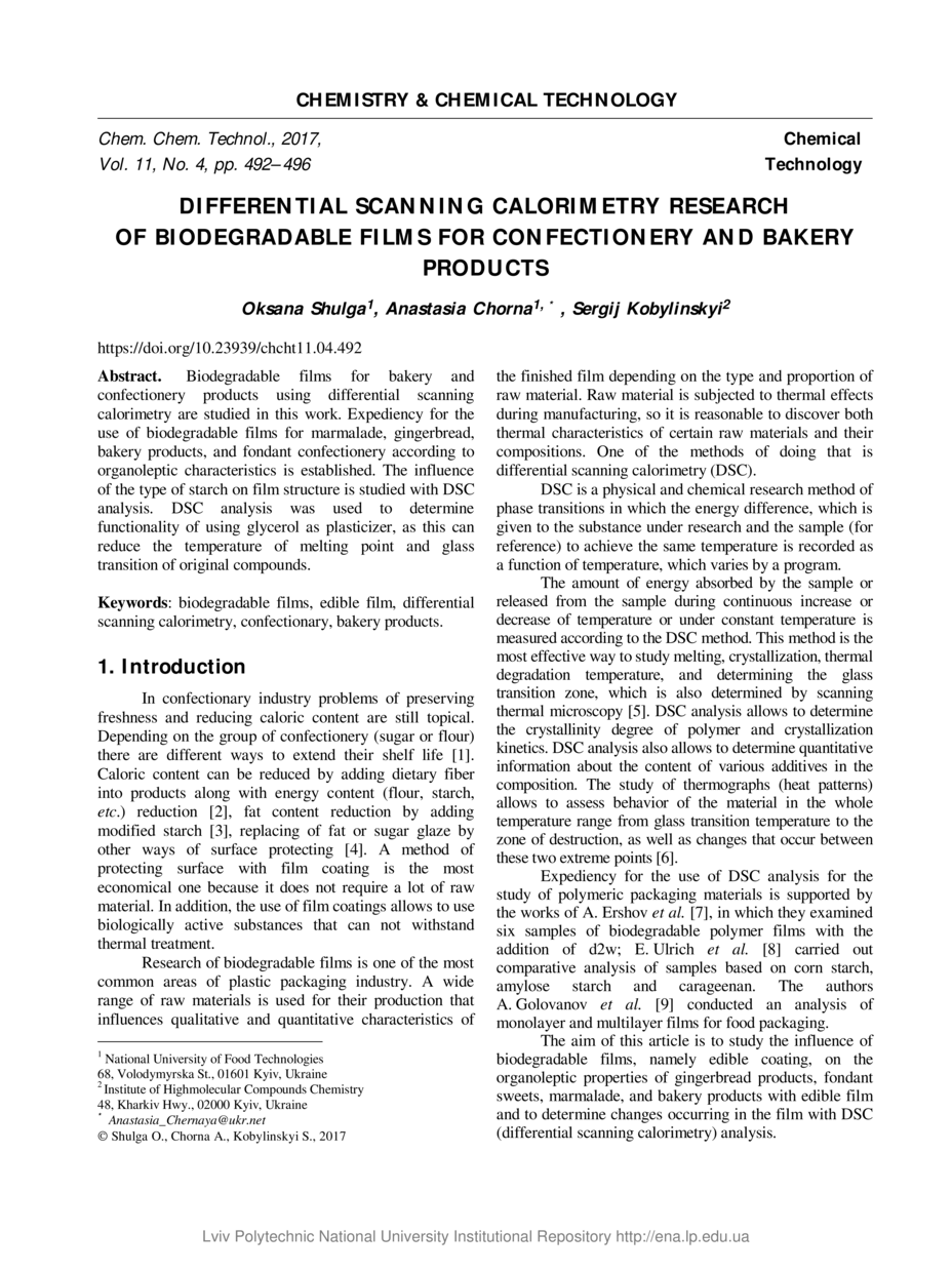 Shulga O. Differential scanning calorimetry research of biodegradable films for confectionery and bakery products / Oksana Shulga, Anastasia Chorna, Sergij Kobylinskyi // Chemistry & Chemical Technology. — Lviv : Lviv Politechnic Publishing House, 2017. — Vol 11. — No 4. — P. 492–496.