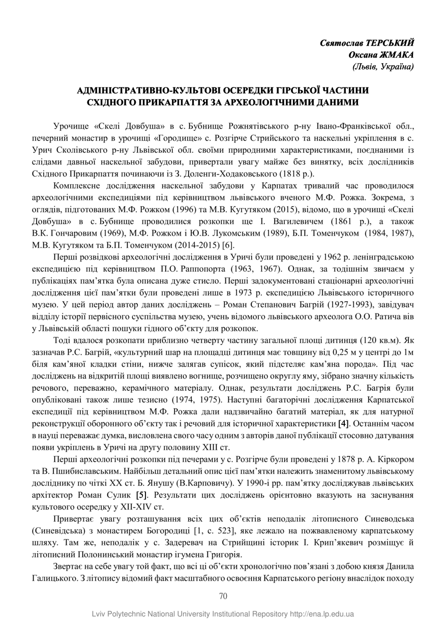| dc.relation.referencesen | 6. Terskyi S. V. Z istorii doslidzhennia arkheolohichno-arkhitekturnoi pamiatky "Skeli Dovbusha" v s. Bubnyshche na Prykarpatti, Per aspera ad astra: do 100-richnoho yuvileiu vidomoho arkheoloha Borysa Tymoshchuka. Tezy dopovidei Mizhnarodnoi naukovoi seminaru konferentsii (Chernivtsi, 8 kvitnia 2019 y.), Chernivtsi: ChNU, 2019, P. 103–105. | |
