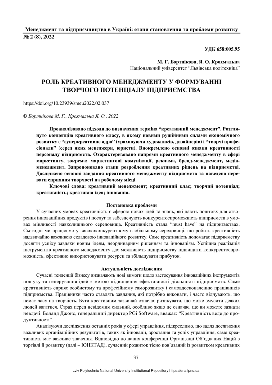 | dc.identifier.citationen | Bortnikova M. H. The role of creative management in forming the creative potential of the enterprise / M. H. Bortnikova, Ya. O. Krokhmalna // Management and Entrepreneurship in Ukraine: the Stages of Formation and Problems of Development. — Lviv : Lviv Politechnic Publishing House, 2022. — Vol 4. — No 2. — P. 37–44. | |