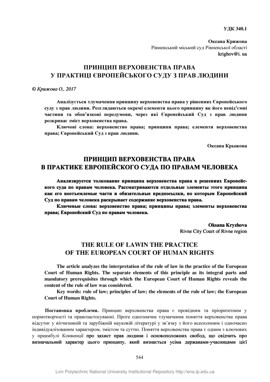 | dc.identifier.citation | Крижова О. Принцип верховенства права у практиці Європейського суду з прав людини / Оксана Крижова // Вісник Національного університету «Львівська політехніка». Серія: юридичні науки : збірник наукових праць. — Львів : Видавництво Львівської політехніки, 2017. — № 865. — С. 544–549. | |