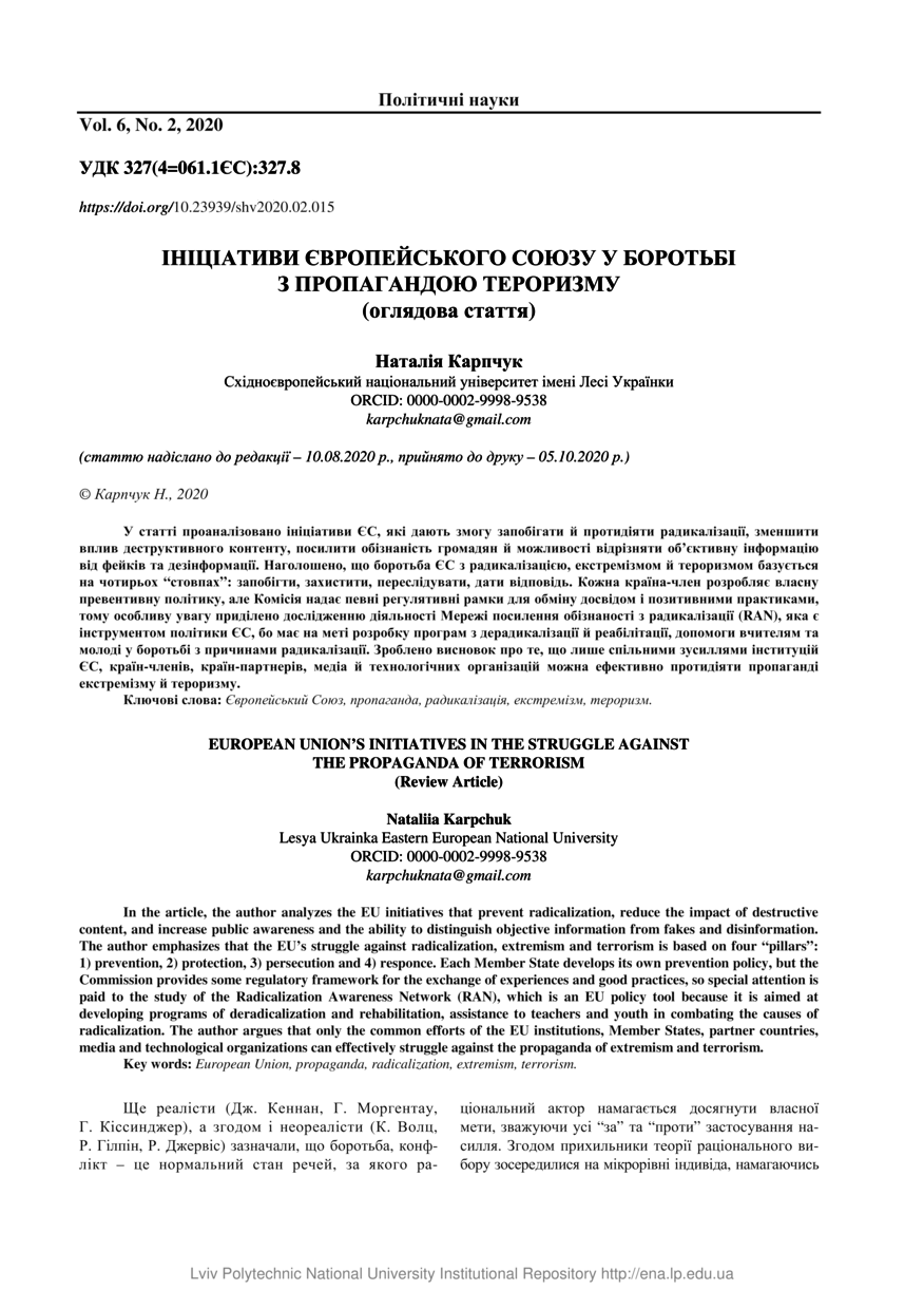 Карпчук Н. Ініціативи Європейського Союзу у боротьбі з пропагандою тероризму / Наталія Карпчук // Гуманітарні візії. — Львів : Видавництво Львівської політехніки, 2020. — Том 6. — № 2. — С. 15–20.