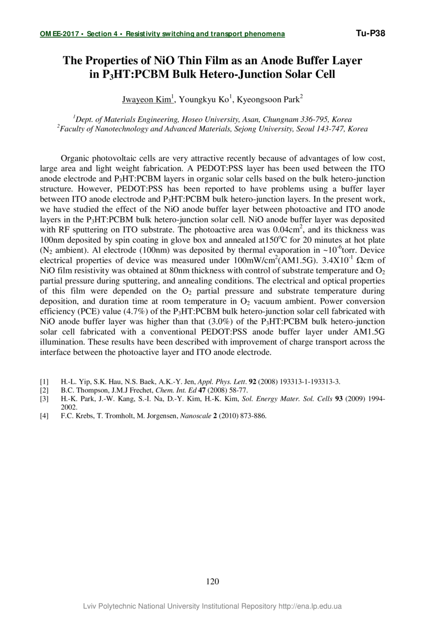 | dc.identifier.citation | Kim J. The Properties of NiO Thin Film as an Anode Buffer Layer in P3HT:PCBM Bulk Hetero-Junction Solar Cell / Jwayeon Kim, Youngkyu Ko, Kyeongsoon Park // Oxide Materials for Electronic Engineering – fabrication, properties and applications : book of abstracts international conference, May 29–June 2, 2017 Lviv, Ukraine. — Lviv, 2017. — P. 120. — (4 resistivity switching and transport phenomena). | |