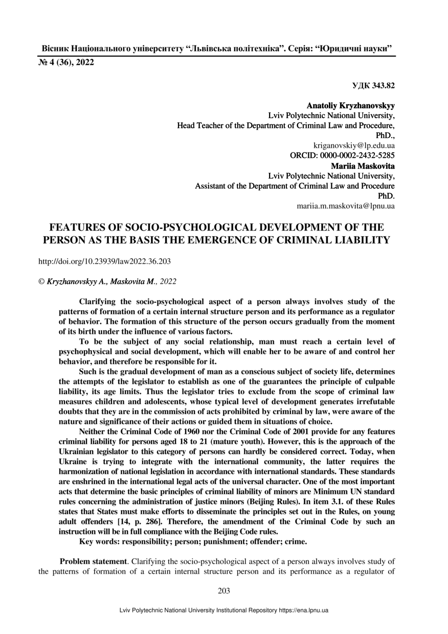 Kryzhanovskyy A. Features of socio-psychological development of the person as the basis the emergence of criminal liability / Anatoliy Kryzhanovskyy, Mariia Maskovita // Вісник Національного університету “Львівська політехніка”. Серія: Юридичні науки. — Lviv : Lviv Politechnic Publishing House, 2022. — No 4 (36). — P. 203–209.