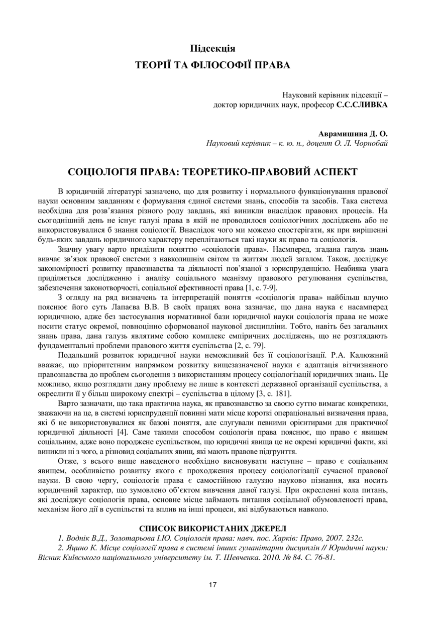 Аврамишина Д. О. Соціологія права: теоретико-правовий аспект / Д. О. Аврамишина, О. Л. Чорнобай // 76-та Студентська науково-технічна конференція. Секція права та психології : збірник тез доповідей, 15–29 жовтня 2018 року, Львів. — Львів : Видавництво Львівської політехніки, 2018. — С. 17–18. — (Теорії та філософії права).