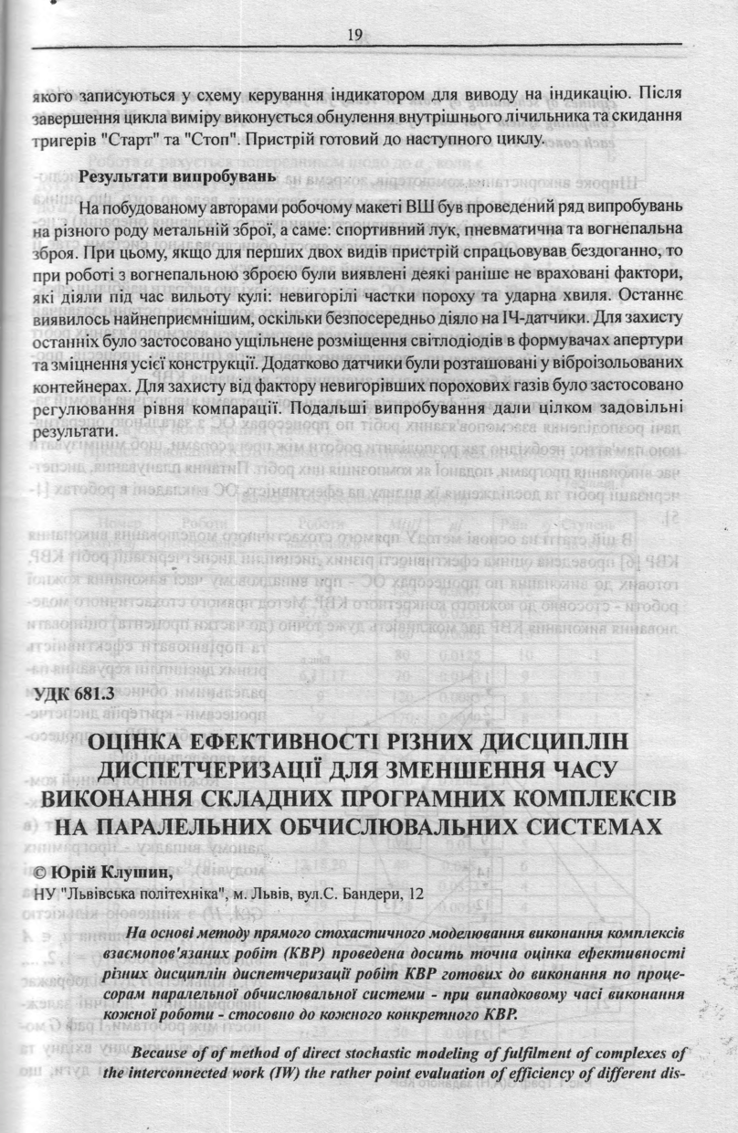 Клушин Ю. Оцінка ефективності різних дисциплін диспетчеризації для зменшення часу виконання складних програмних комплексів на паралельних обчислювальних системах / Ю. Клушин // Вісник Національного університету “Львівська політехніка”. — Львів : Видавництво Національного університету “Львівська політехніка”, 2000. — № 413 : Комп’ютерна інженерія та інформаційні технології. — С. 19–23. — (Архітектура та компоненти комп'ютерних систем).