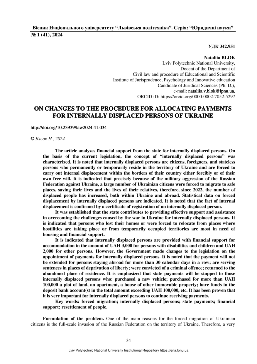 Blok N. On changes to the procedure for allocating payments for internally displaced persons of Ukraine / Blok Nataliia // Bulletin of Lviv Polytechnic National University. Series: Legal Sciences. — Lviv : Lviv Politechnic Publishing House, 2024. — No 1(41). — P. 34–40.