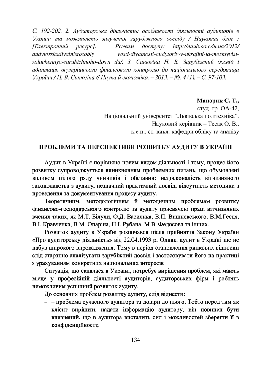 Манорик С. Т. Проблеми та перспективи розвитку аудиту в Україні / С. Т. Манорик, О. В. Тесак // Облік, аналіз і контроль в системі управління суб’єктами економіки : тези доповідей ІV Міжнародної студентської наукової конференції, 18–19 жовтня 2018 року, Львів. — Львів : Видавництво Львівської політехніки, 2018. — С. 134–136. — (Проблеми та перспективи розвитку аудиторської діяльності в Україні).