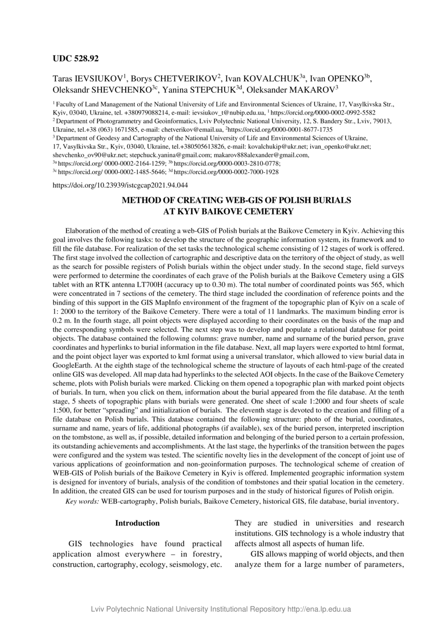 | dc.identifier.citation | Method of creating WEB-GIS of polish burials at Baikove cemetery in Kyiv / Taras Ievsiukov, Borys Chetverikov, Ivan Kovalchuk, Ivan Openko, Oleksandr Shevchenko, Yanina Stepchuk, Oleksandr Makarov // Geodesy, Cartography and Aerial Photography. — Lviv : Lviv Politechnic Publishing House, 2021. — Vol 94. — P. 44–53. | |