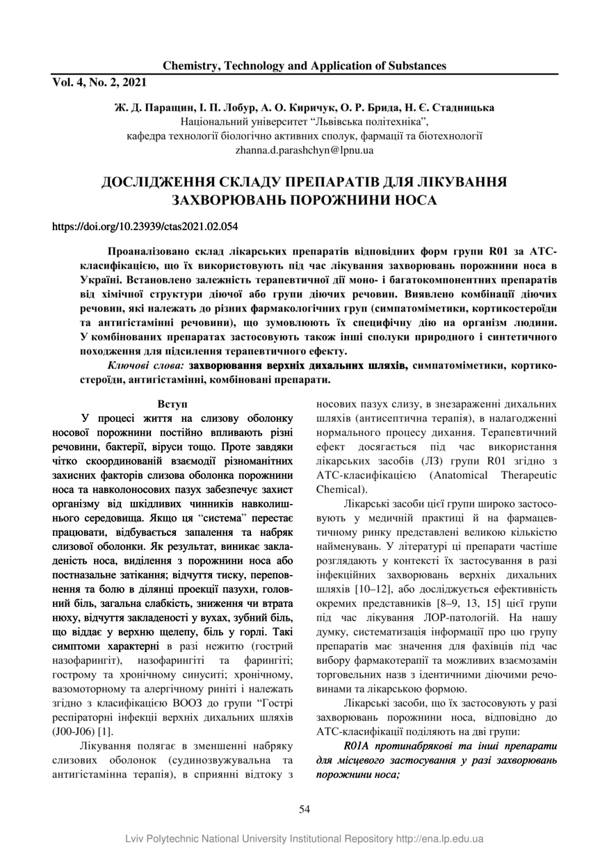 | dc.identifier.citationen | Study of the composition of drugs for the treatment of diseases of the nose cavity / Zh. D. Parashchyn, I. P. Lobur, A. O. Kyrychuk., O. R. Bryda, N. Ye. Stadnytska // Chemistry, Technology and Application of Substances. — Lviv : Lviv Politechnic Publishing House, 2021. — Vol 4. — No 2. — P. 54–63. | |