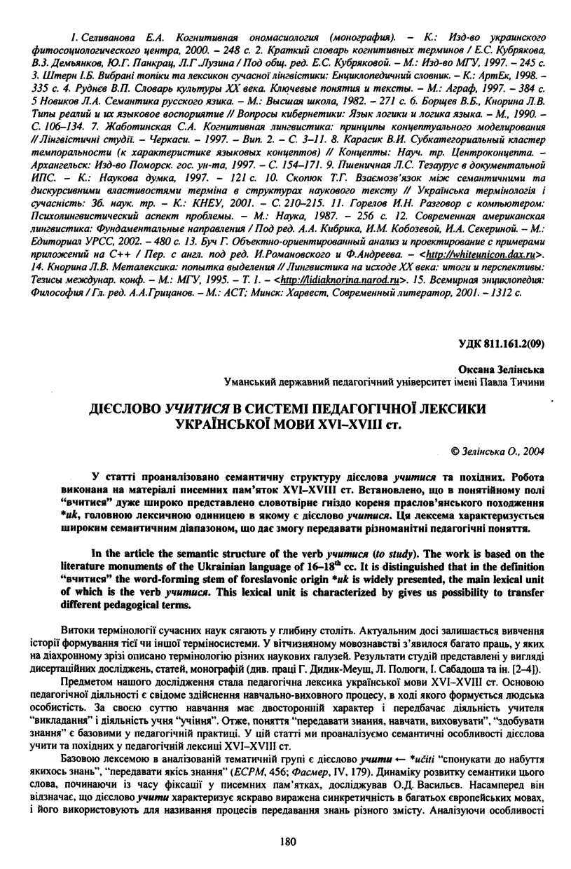 Зелінська О. Дієслово учитися в системі педагогічної лексики української мови ХVІ-ХVІІІ ст. / О. Зелінська // Вісник Національного університету “Львівська політехніка”. — Львів : Видавництво Національного університету “Львівська політехніка”, 2004. — № 503 : Проблеми української термінології. — С. 180–184.