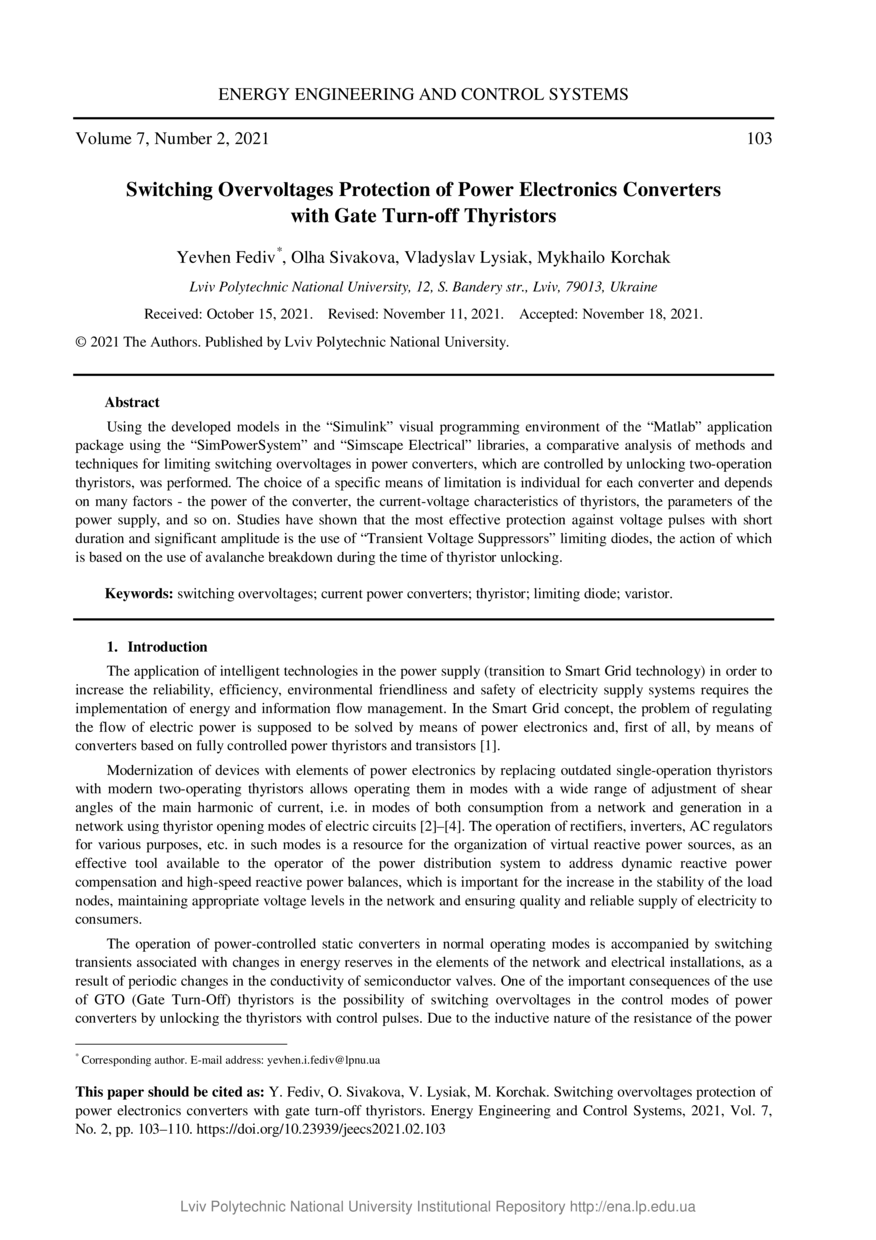 | dc.identifier.citationen | Switching overvoltages protection of power electronics converters with gate turn-off thyristors / Yevhen Fediv, Olha Sivakova, Vladyslav Lysiak, Mykhailo Korchak // Energy Engineering and Control Systems. — Lviv : Lviv Politechnic Publishing House, 2021. — Vol 7. — No 2. — P. 103–110. | |