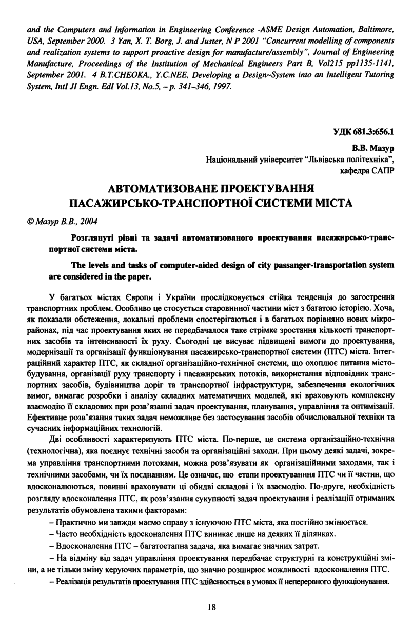 Мазур В. В. Автоматизоване проектування пасажирсько-транспортної системи міста / В. В. Мазур // Вісник Національного університету “Львівська політехніка”. — Львів : Видавництво Національного університету “Львівська політехніка”, 2004. — № 522 : Комп’ютерні системи проектування. Теорія і практика. — С. 18–21.