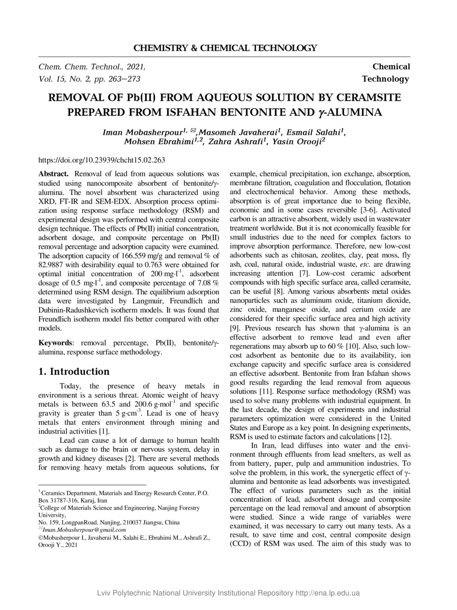 | dc.identifier.citationen | Removal of Pb(II) from Aqueous Solution by Ceramsite Prepared from Isfahan Bentonite and γ-Alumina / Iman Mobasherpour, Masomeh Javaherai, Esmail Salahi, Mohsen Ebrahimi, Zahra Ashrafi, Yasin Orooji // Chemistry & Chemical Technology. — Lviv : Lviv Politechnic Publishing House, 2021. — Vol 15. — No 2. — P. 263–273. | |