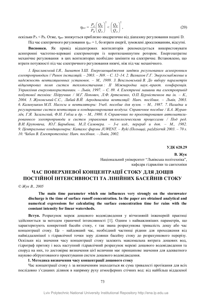 Жук В. Час поверхневої концентрації стоку для дощів постійної інтенсивності та лінійних басейнів стоку / В. Жук // Вісник Національного університету “Львівська політехніка”. — Львів : Видавництво Національного університету “Львівська політехніка”, 2005. — № 537 : Теплоенергетика. Інженерія довкілля. Автоматизація. — С. 73–81.