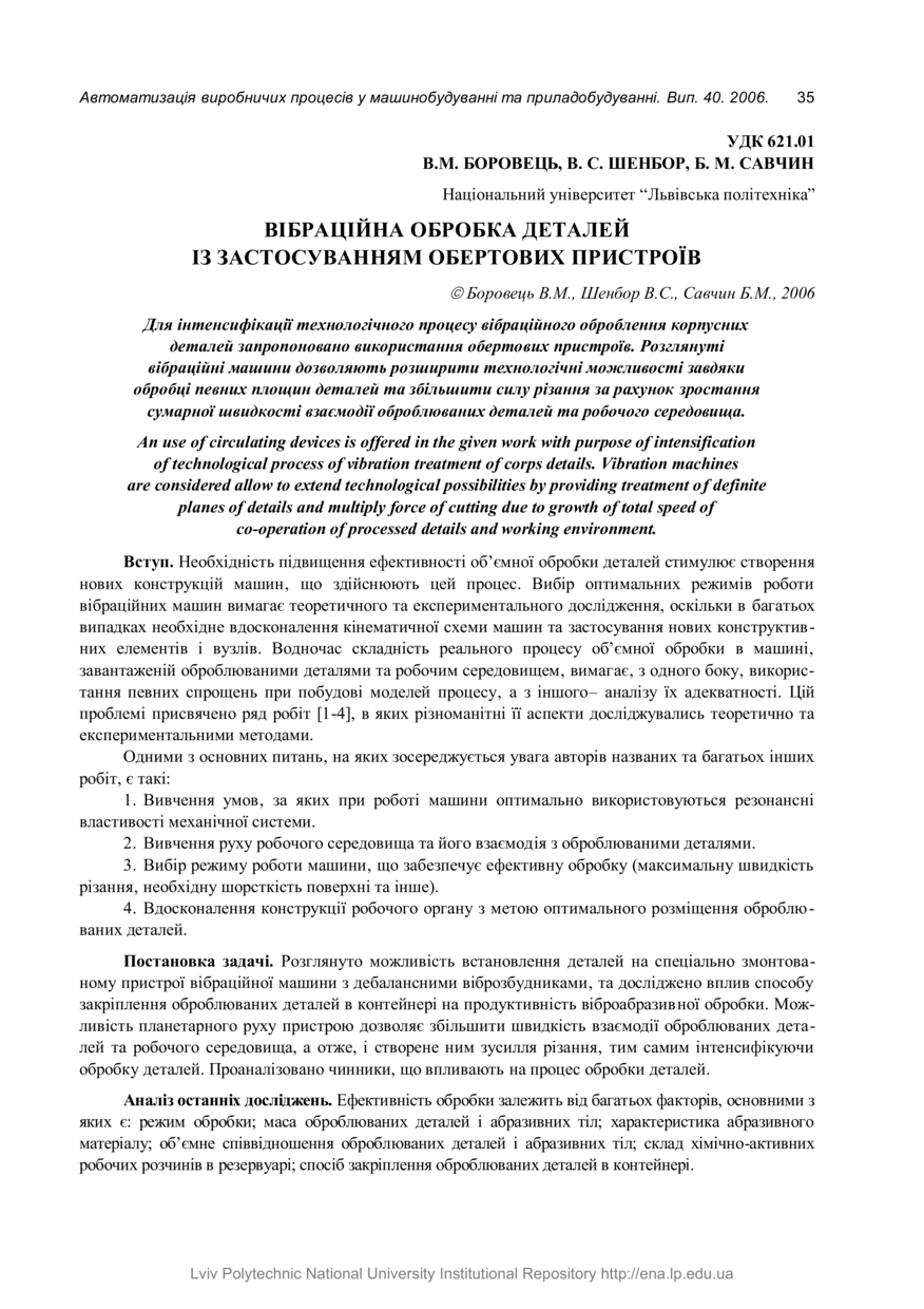 | dc.identifier.citationen | Borovets V. M. Vibratsiina obrobka detalei iz zastosuvanniam obertovykh prystroiv / V. M. Borovets, V. S. Shenbor, B. M. Savchin // Avtomatyzatsiia vyrobnychykh protsesiv u mashynobuduvanni ta pryladobuduvanni : ukrainskyi mizhvidomchyi naukovo-tekhnichnyi zbirnyk. — Lviv : Vydavnytstvo Natsionalnoho universytetu "Lvivska politekhnika", 2006. — No 40. — P. 35–39. | |