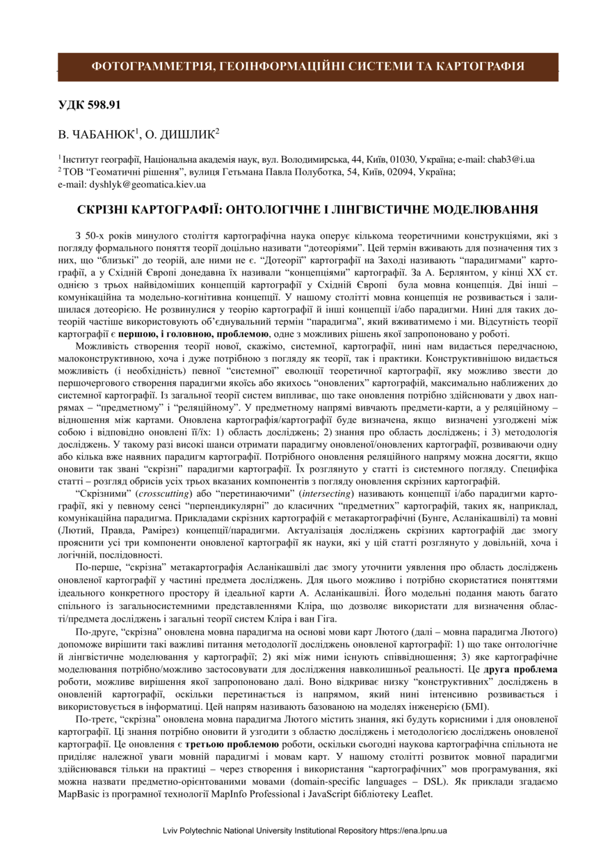 Чабанюк В. Скрізні картографії: онтологічне і лінгвістичне моделювання / В. Чабанюк, О. Дишлик // Сучасні досягнення геодезичної науки та виробництва. — Львів : Видавництво Львівської політехніки, 2024. — Том 1. — № 47. — С. 126–139.