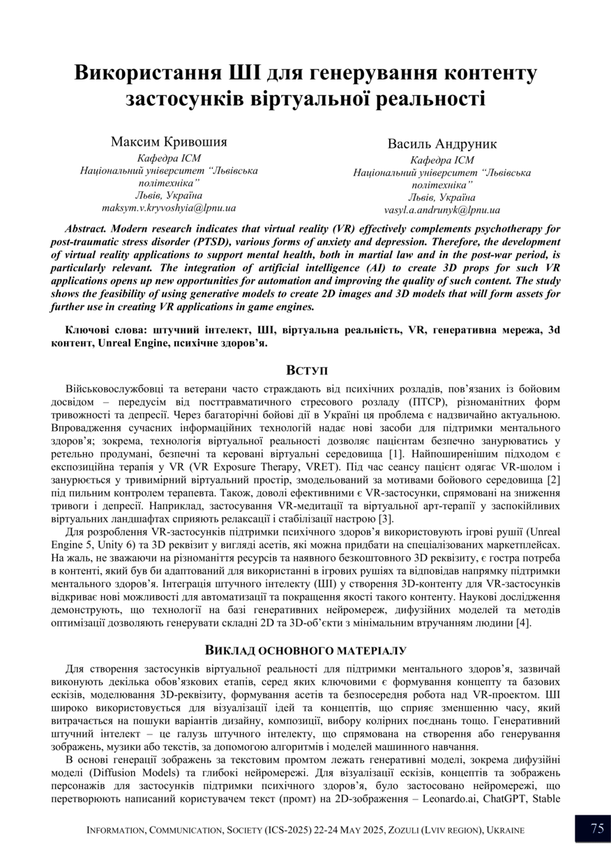 Кривошия М. Використання ШІ для генерування контенту застосунків віртуальної реальності / Максим Кривошия, Василь Андруник // Інформація, комунікація, суспільство 2025: ICS-2025 : матеріали XIV Міжнародної наукової конференції, 22-24 травня 2025 року, Львів. — Львів : Видавництво Львівської політехніки, 2025. — С. 75–76. — (Системи штучного інтелекту та машинне навчання).