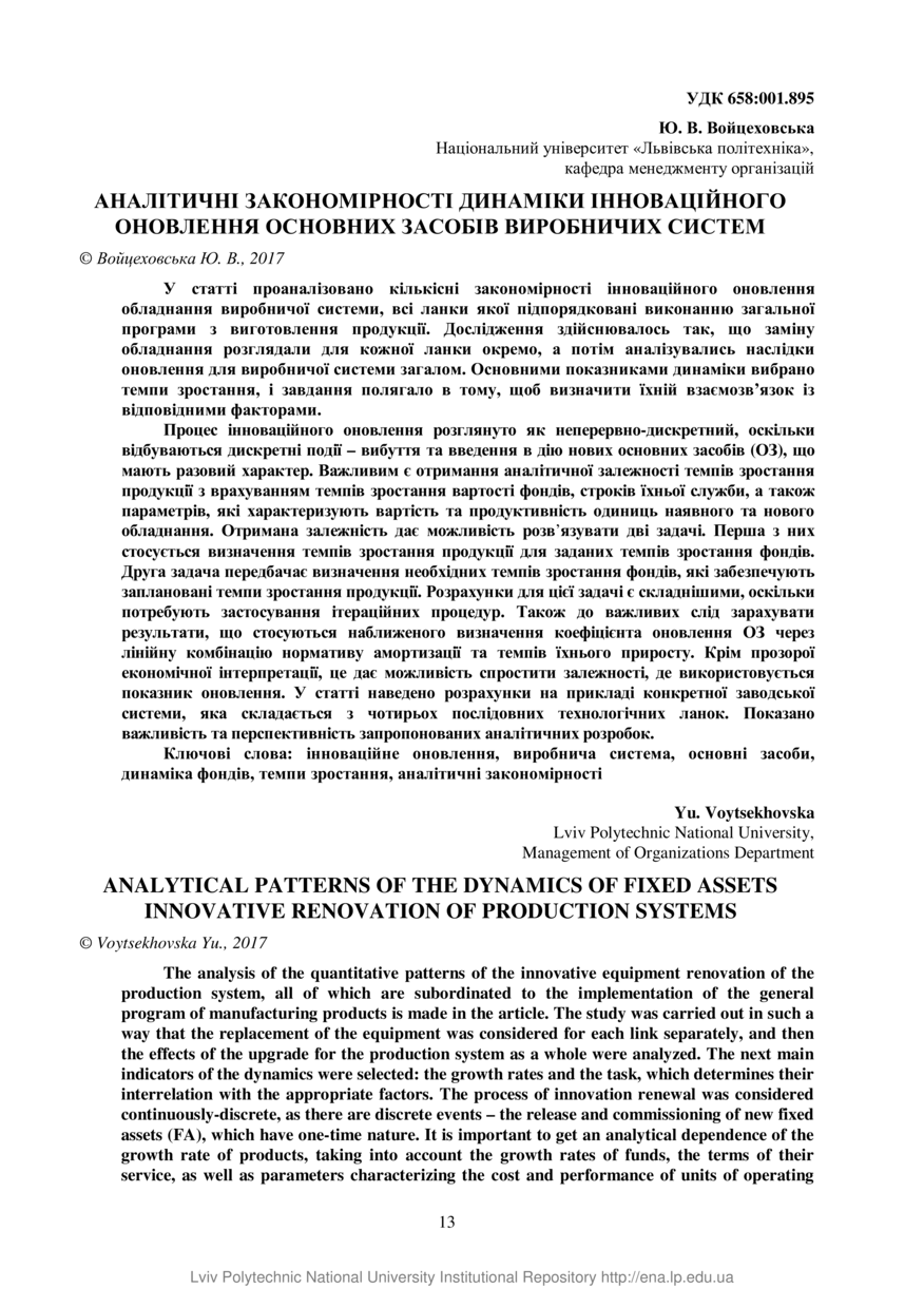 Войцеховська Ю. В. Аналітичні закономірності динаміки інноваційного оновлення основних засобів виробничих систем / Ю. В. Войцеховська // Вісник Національного університету «Львівська політехніка». Серія: Проблеми економіки та управління. — Львів : Видавництво Львівської політехніки, 2017. — № 873. — С. 13–17.