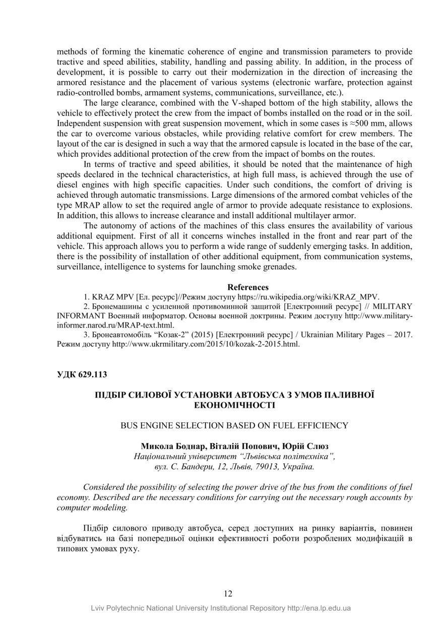 Боднар М. Підбір силової установки автобуса з умов паливної економічності / Микола Боднар, Віталій Попович, Юрій Слюз // Автобусобудування та пасажирські перевезення в Україні : тези доповідей III-ої Всеукраїнської науково-практичної конференції, Львів, 22-23 лютого 2018 року. — Львів : Видавництво Львівської політехніки, 2018. — С. 12–14. — (Автобусо- та автомобілебудування).