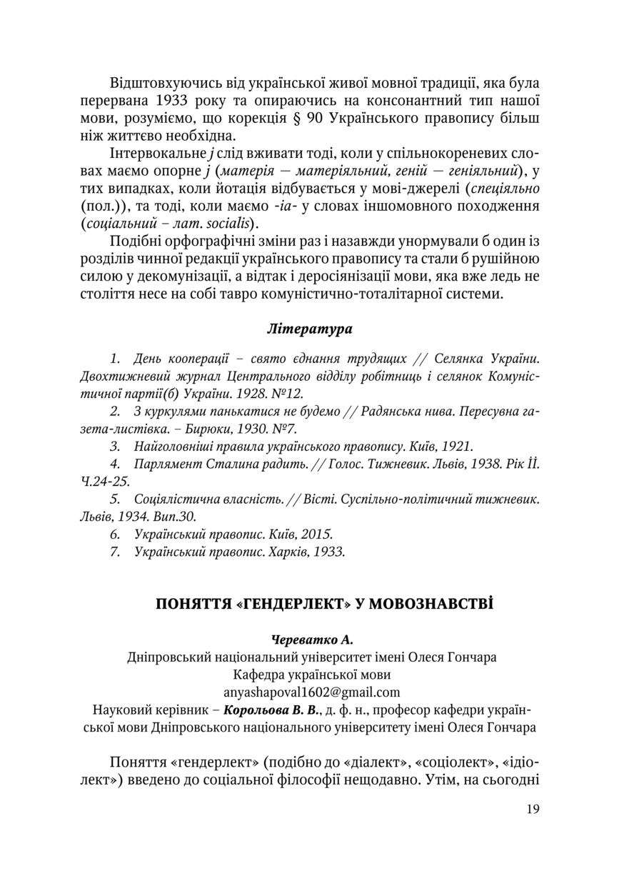 Череватко А. Поняття «гендерлект» у мовознавстві / А. Череватко, В. В. Корольова // Українська мова в просторі й часі : матеріали Всеукраїнської студентської науково-практичної конференції, 17–19 квітня 2019 року, Львів. — Львів : Видавництво Львівської політехніки, 2019. — С. 19–21. — (Українська мова в сучасних реаліях).