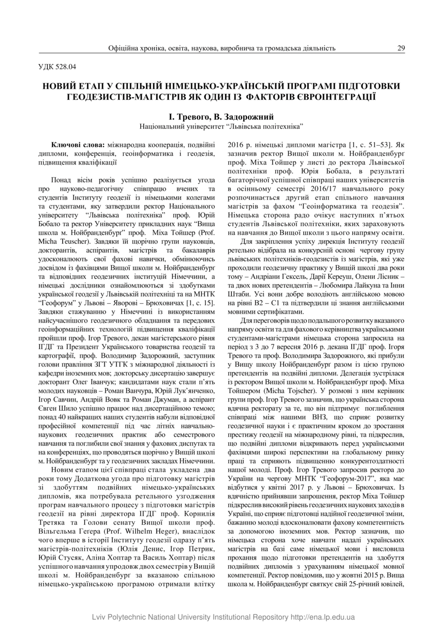 Тревого І. Новий етап у спільній німецько-українській програмі підготовки геодезистів-магістрів як один із факторів євроінтеграції / І. Тревого, В. Задорожний // Сучасні досягнення геодезичної науки та виробництва. — Львів, 2017. — Том 1 (33). — С. 29–30.