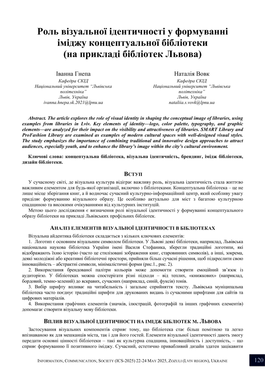 Гнепа І. Роль візуальної ідентичності у формуванні іміджу концептуальної бібліотеки (на прикладі бібліотек Львова) / Іванна Гнепа, Наталія Вовк // Інформація, комунікація, суспільство 2025: ICS-2025 : матеріали XIV Міжнародної наукової конференції, 22-24 травня 2025 року, Львів. — Львів : Видавництво Львівської політехніки, 2025. — С. 120–121. — (Інформаційні та комунікаційні технології в соціальних середовищах інтернету).