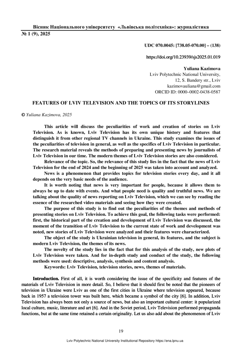 | dc.identifier.citationen | Kazimova Y. Features of Lviv Television and the topics of its storylines / Yuliana Kazimova // Bulletin of Lviv Polytechnic National University series: “Journalistic sciences”. — Lviv : Lviv Politechnic Publishing House, 2025. — No 1(9). — P. 19–27. | |