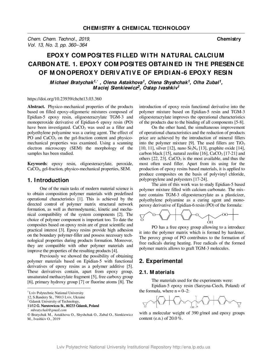 | dc.title.alternative | Епоксидні композити з натуральним наповнювачем карбонатом кальцію. 1. Одержання епоксидних композитів у присутності монопероксидної похідної епоксидної смоли epidian-6 | |
