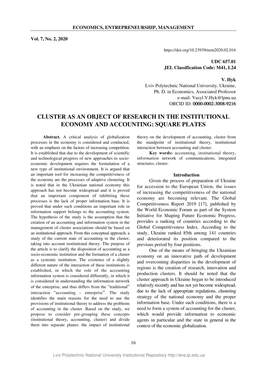 Hyk V. Cluster as an object of research in the institutional economy and accounting: square plates / V. Hyk // Economics, Entrepreneurship, Management. — Lviv : Lviv Politechnic Publishing House, 2020. — Vol 7. — No 2. — P. 16–21.