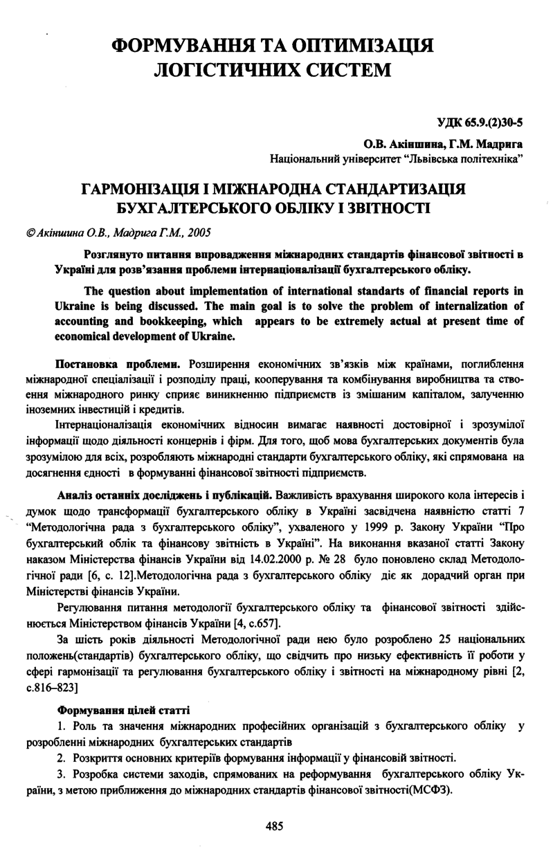 Акіншина О. В. Гармонізація і міжнародна стандартизація бухгалтерського обліку і звітності / О. В. Акіншина, Г. М. Мадрига // Вісник Національного університету “Львівська політехніка”. — Львів : Видавництво Національного університету “Львівська політехніка”, 2005. — № 526 : Логістика. — С. 485–490. — (Формування та оптимізація логістичних систем).