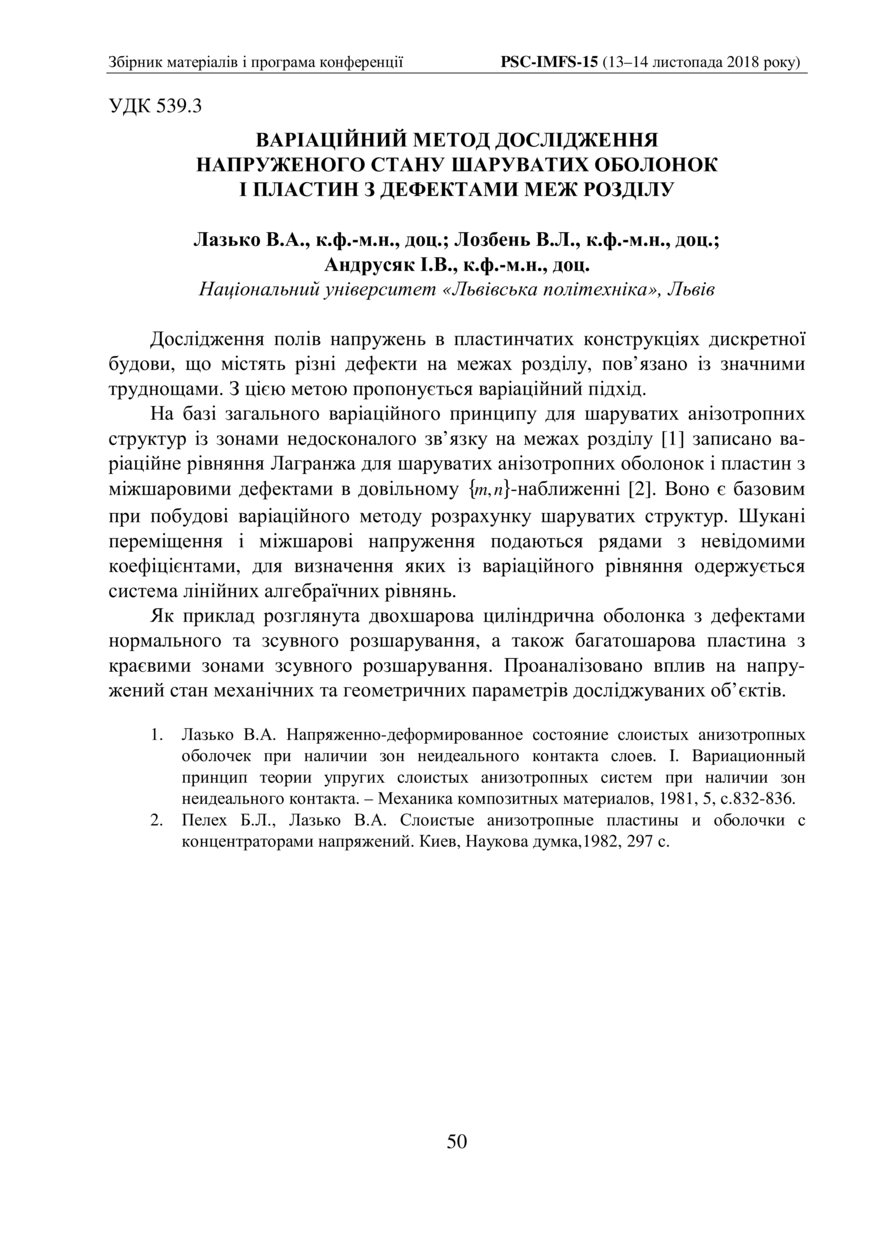 Лазько В. А. Варіаційний метод дослідження напруженого стану шаруватих оболонок і пластин з дефектами меж розділу / В. А. Лазько, В. Л. Лозбень, І. В. Андрусяк // 15-та Відкрита наукова конференція Інституту прикладної математики та фундаментальних наук (ІМФН) : збірник матеріалів і програма конференції, 13–14 листопада 2018 року, Львів. — Львів : Видавництво Львівської політехніки, 2018. — С. 50. — (Прикладна математика).