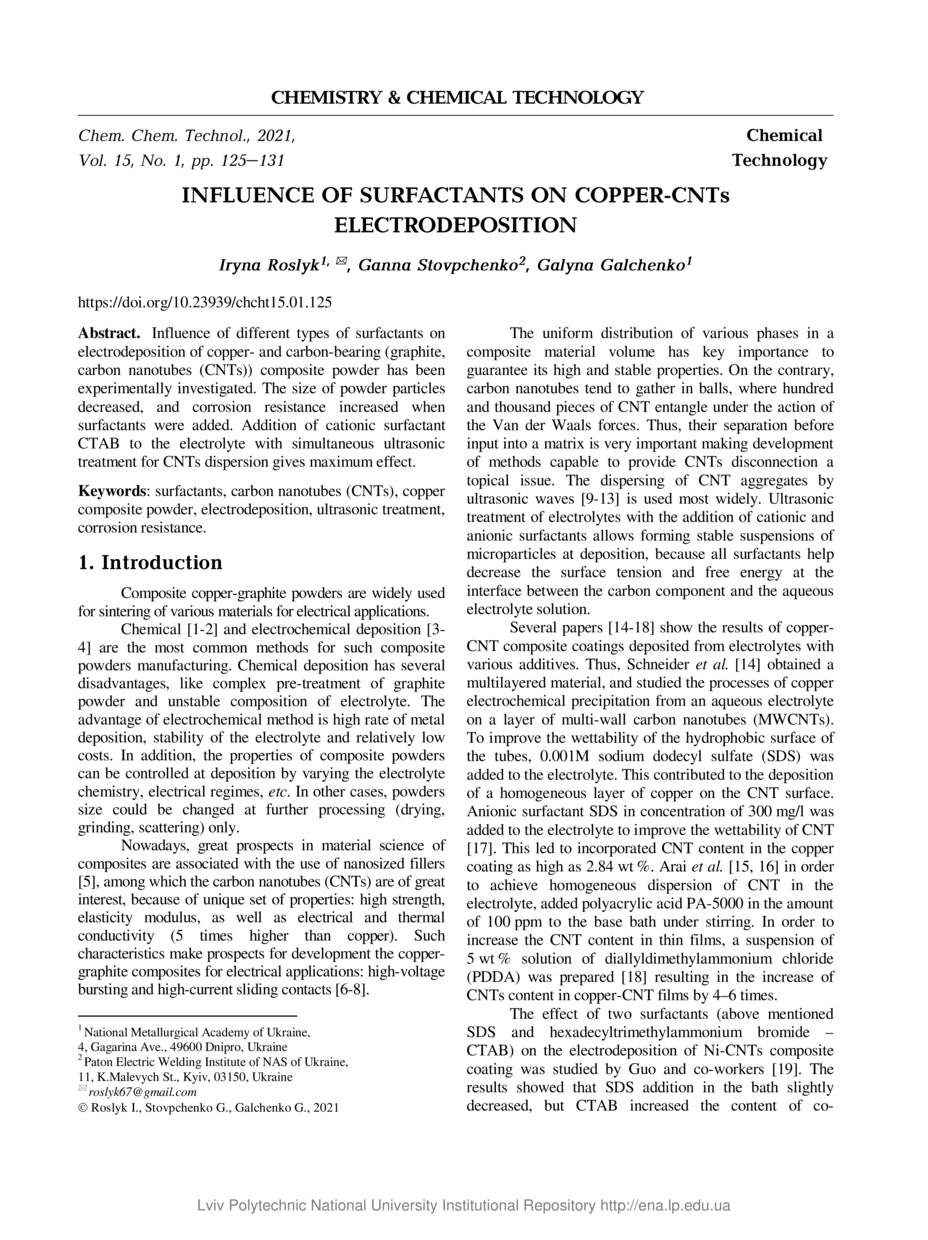 | dc.identifier.citationen | Roslyk I. Influence of Surfactants on Copper-CNTs Electrodeposition / Iryna Roslyk, Ganna Stovpchenko, Galyna Galchenko // Chemistry & Chemical Technology. — Lviv : Lviv Politechnic Publishing House, 2021. — Vol 15. — No 1. — P. 125–131. | |