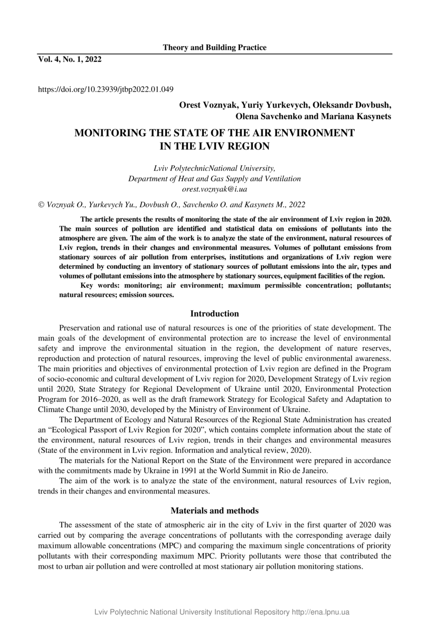 Monitoring the state of the air environment in the Lviv region / Orest Voznyak, Yuriy Yurkevych, Oleksandr Dovbush, Olena Savchenko, Mariana Kasynets // Theory and Building Practice. — Lviv : Lviv Politechnic Publishing House, 2022. — Vol 4. — No 1. — P. 49–56.