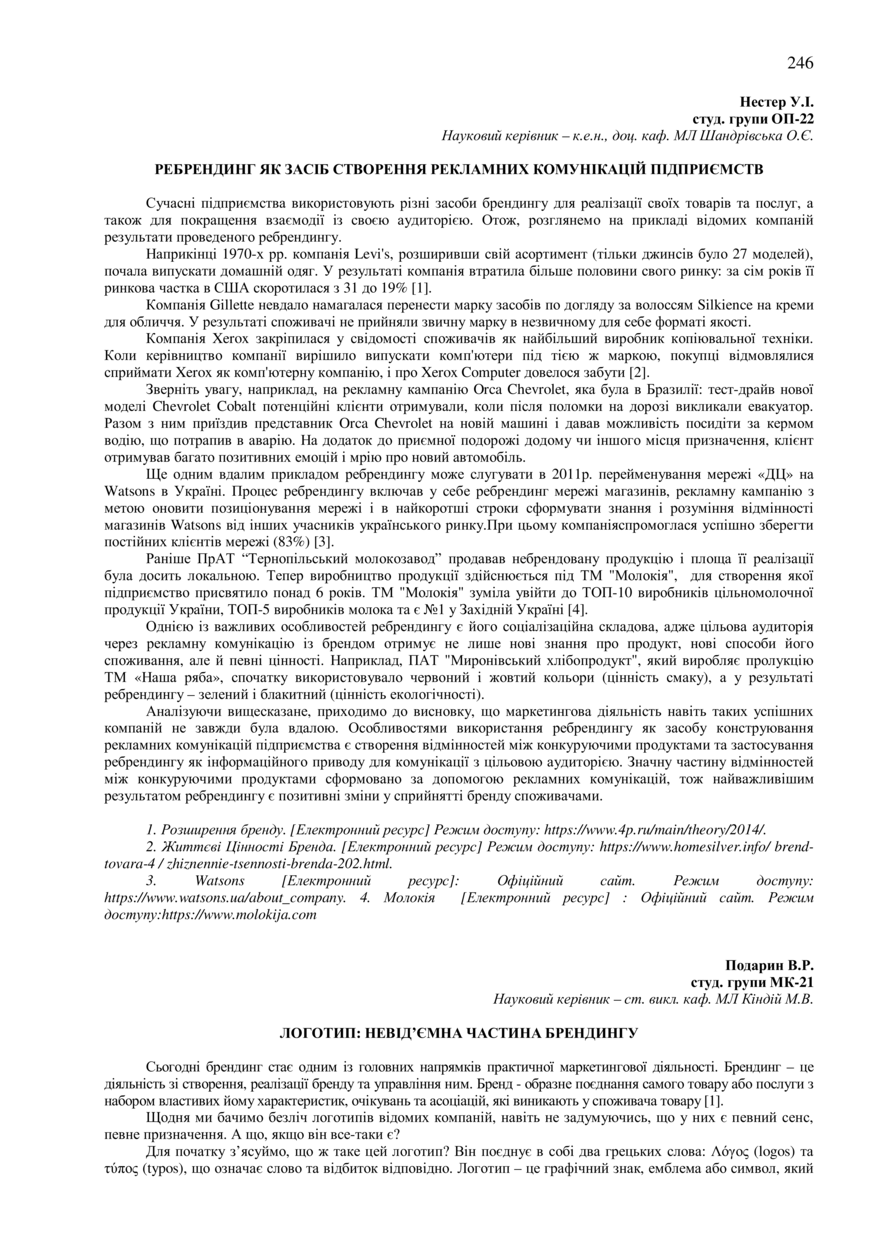 Нестер У. І. Ребрендинг як засіб створення рекламних комунікацій підприємств / У. І. Нестер, О. Є. Шандрівська // 76-та Студентська науково-технічна конференція. Секція "Економіка і менеджмент" : збірник тез доповідей, жовтень – листопад 2018 року. — Львів : Видавництво Львівської політехніки, 2018. — С. 246. — (Маркетинг в структурі управління підприємством в умовах цифрової економіки).