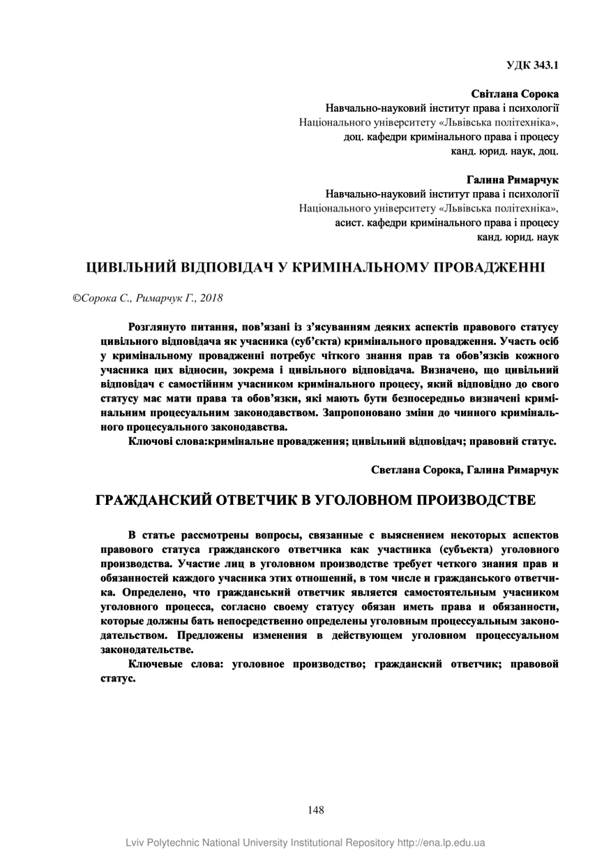 Сорока С. Цивільний відповідач у кримінальному провадженні / Світлана Сорока, Галина Римарчук // Вісник Національного університету “Львівська політехніка”. Серія: Юридичні науки. — Львів : Видавництво Львівської політехніки, 2018. — № 894, випуск 18. — С. 148–153. — (Кримінальне право та процес).