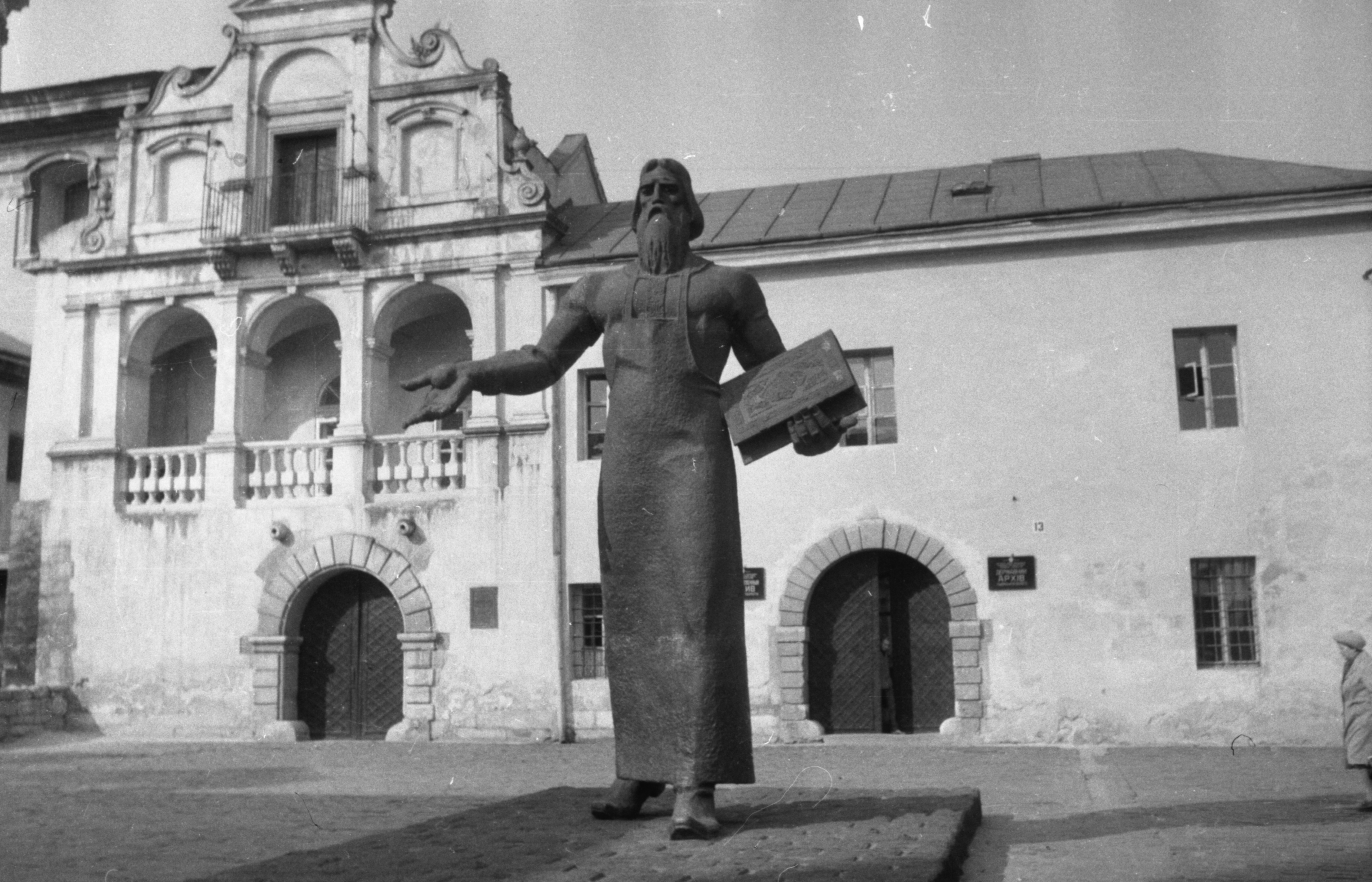Пам'ятник Івану Федорову та будинок Державного архіву Львівської області. Пам'ятник — скульптура Івана Федорова з книгою.