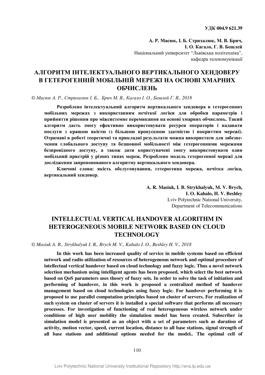 Алгоритм інтелектуального вертикального хендоверу в гетерогенній мобільній мережі на основі хмарних обчислень / А. Р. Масюк, І. Б. Стрихалюк, М. В. Брич, І. О. Кагало, Г. В. Бешлей // Вісник Національного університету «Львівська політехніка». Серія: Радіоелектроніка та телекомунікації, 2017-03-28. — Львів : Видавництво Львівської політехніки, 2017. — № 874. — С. 110–121.