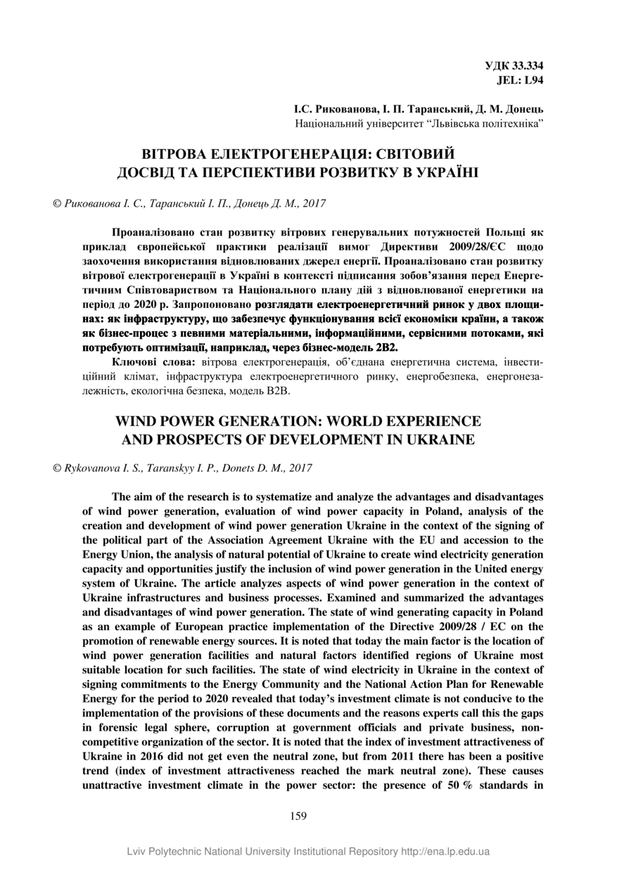 Рикованова І. С. Вітрова електрогенерація: світовий досвід та перспективи розвитку в Україні / І. С. Рикованова, І. П. Таранський, Д. М. Донець // Вісник Національного університету «Львівська політехніка». Серія: Логістика. — Львів : Видавництво Львівської політехніки, 2017. — № 863. — С. 159–167.