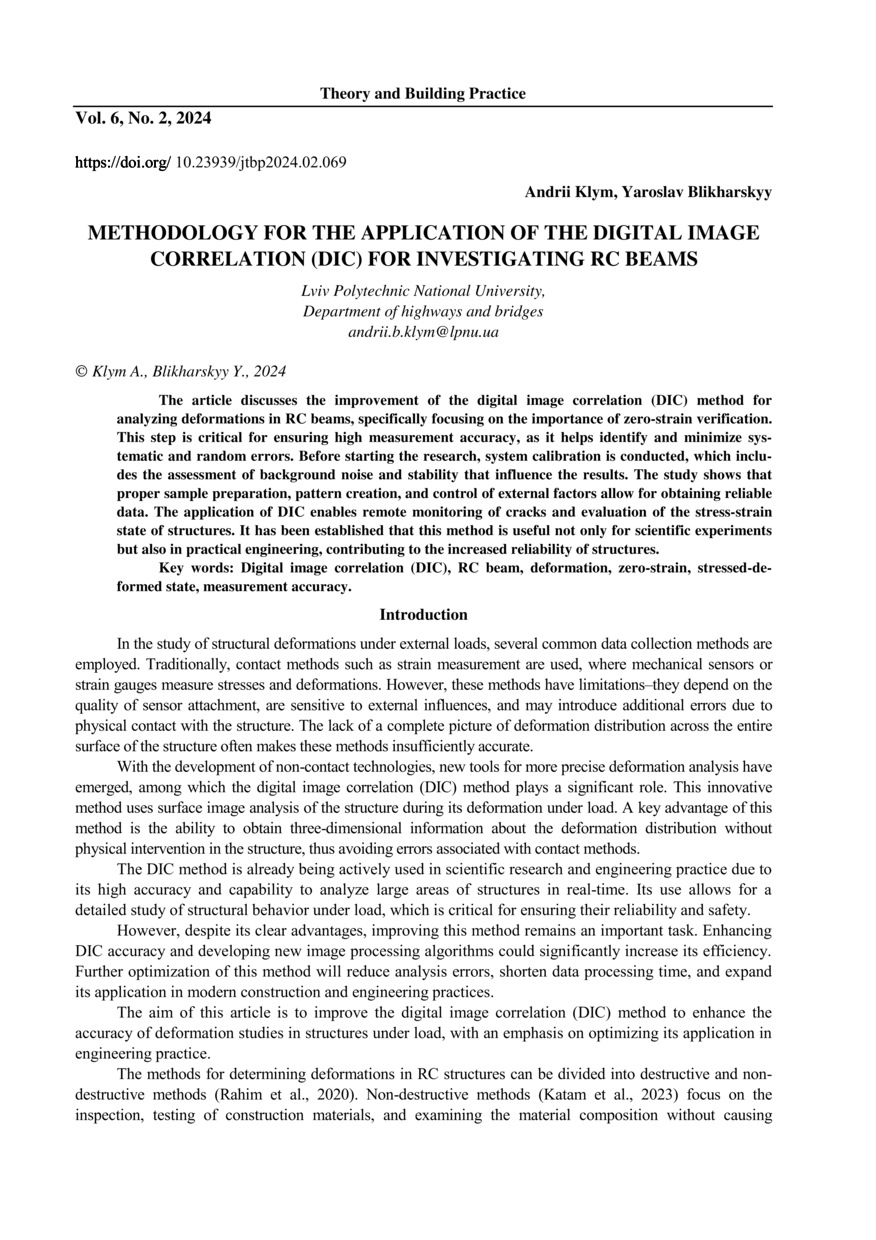 Klym A. Methodology for the application of the digital image correlation (DIC) for investigating RC beams / Andrii Klym, Yaroslav Blikharskyy // Theory and Building Practice. — Lviv : Lviv Politechnic Publishing House, 2024. — Vol 6. — No 2. — P. 69–80.