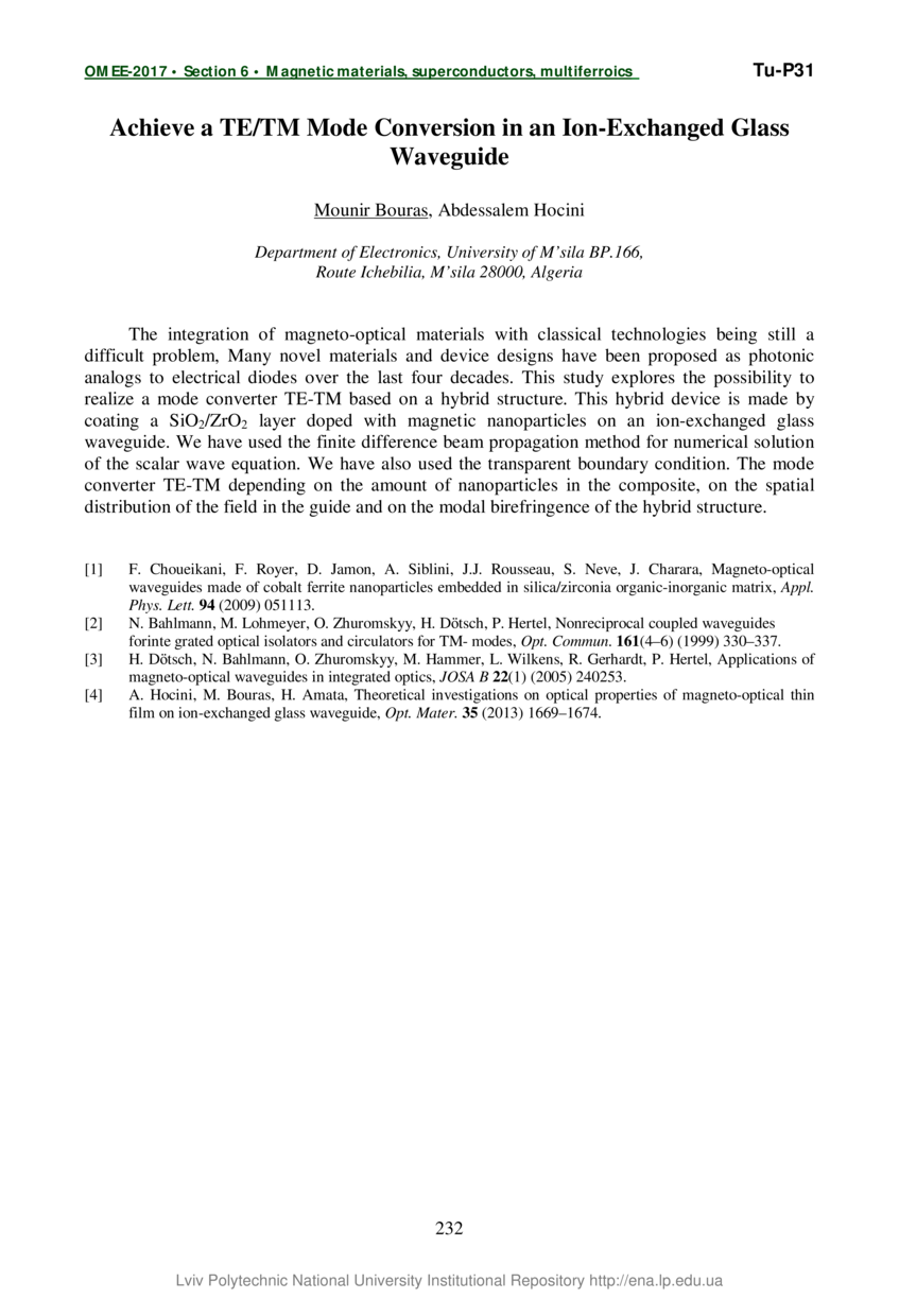 Bouras M. Achieve a TE/TM Mode Conversion in an Ion-Exchanged Glass Waveguide / Mounir Bouras, Abdessalem Hocini // Oxide Materials