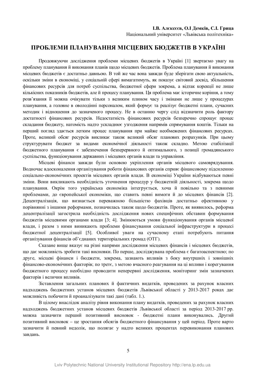 Алєксєєв І. В. Проблеми планування місцевих бюджетів в Україні / І. В. Алєксєєв, О. І. Демків, С. І. Грица // Фінансовий ринок: інституції та інструменти, 3–6 червня 2018 року, Львів. — Львів : Видавництво Львівської політехніки, 2018. — С. 5–6.