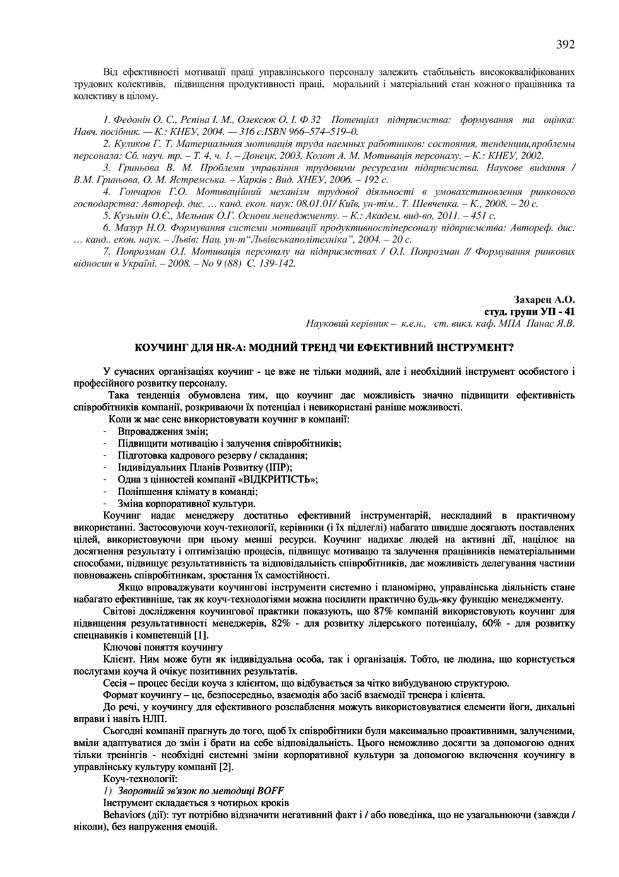 Захарец А. О. Коучинг для HR-А: модний тренд чи ефективний інструмент? / А. О. Захарец, Я. В. Панас // 76-та Студентська науково-технічна конференція. Секція "Економіка і менеджмент" : збірник тез доповідей, жовтень – листопад 2018 року. — Львів : Видавництво Львівської політехніки, 2018. — С. 392–393. — (Актуальні проблеми і напрями розвитку менеджменту персоналу та економіки праці в сучасних реаліях).