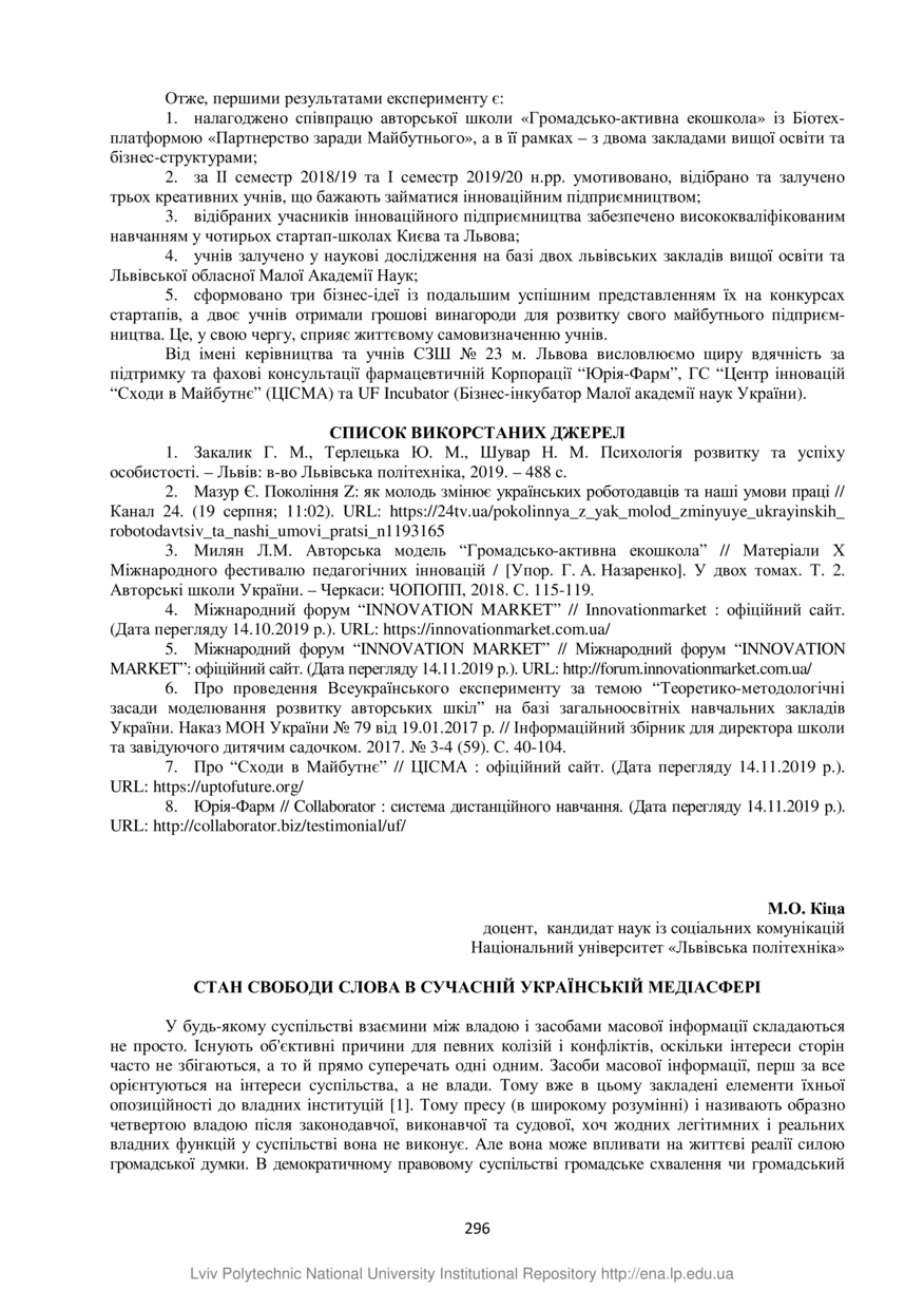Кіца М. О. Стан свободи слова в сучасній українській медіасфері / М. О. Кіца // Захист прав і свобод людини та громадянина в умовах формування правової держави : збірник тез ІХ Всеукраїнської науково-практичної конференції, 30 травня 2020 року, Львів. — Львів : Видавництво Львівської політехніки, 2020. — С. 296–298. — (Свобода ЗМІ і свобода слова та психологічні аспекти в контексті захисту прав і свобод людини та громадянина в умовах формування правової держави).